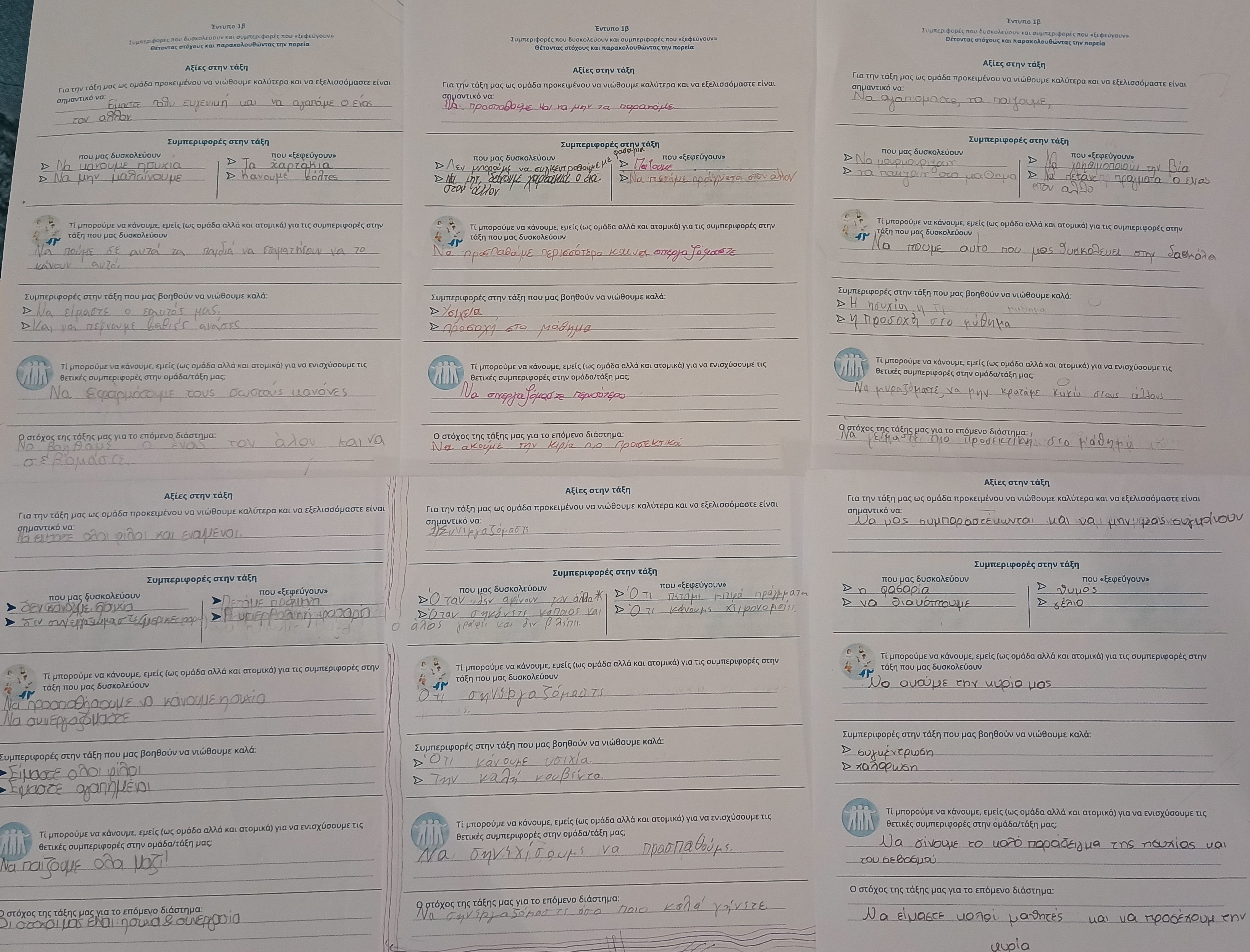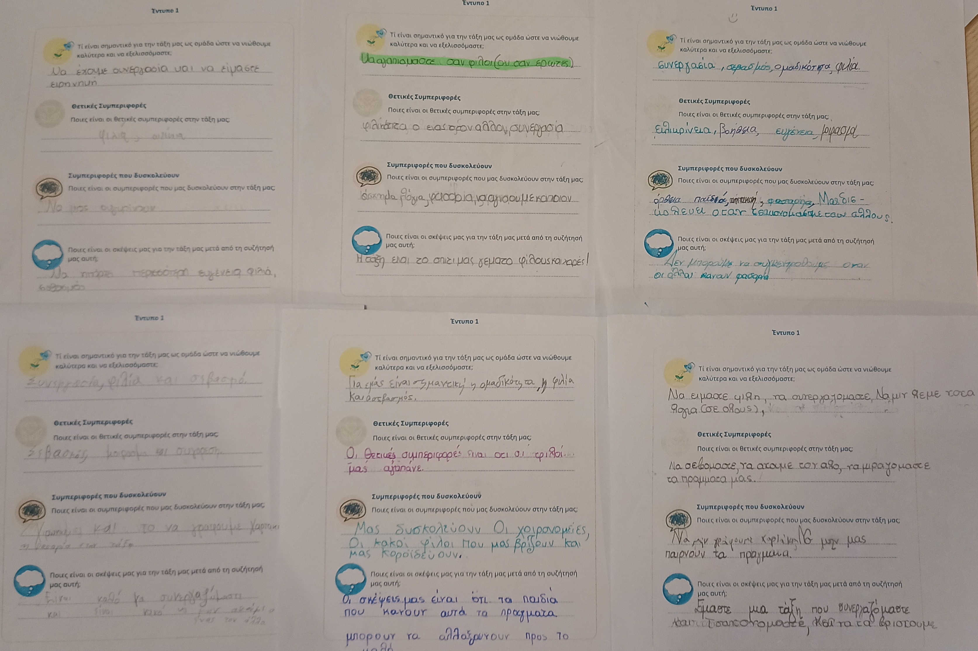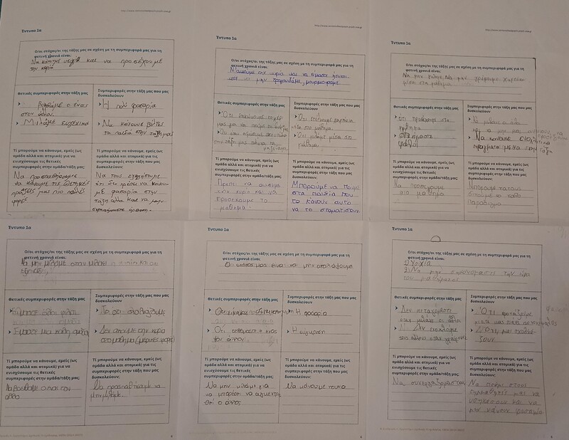 Αρχικά, συζητήσαμε με τους μαθητές και εντοπίσαμε τις συμπεριφορές εκείνες που μας βοηθούν και μας κάνουν να αισθανόμαστε όμορφα και να εξελισσόμαστε, αλλά κι εκείνες που μας κάνουν να αισθανόμαστε άβολα και μας δυσκολεύουν στην τάξη. Στη συνέχεια, θέσαμε στόχους για το επόμενο διάστημα, ώστε να διατηρήσουμε και να ενισχύσουμε τις θετικές συμπεριφορές, αλλά και να αλλάξουμε προς το καλύτερο τις αρνητικές.