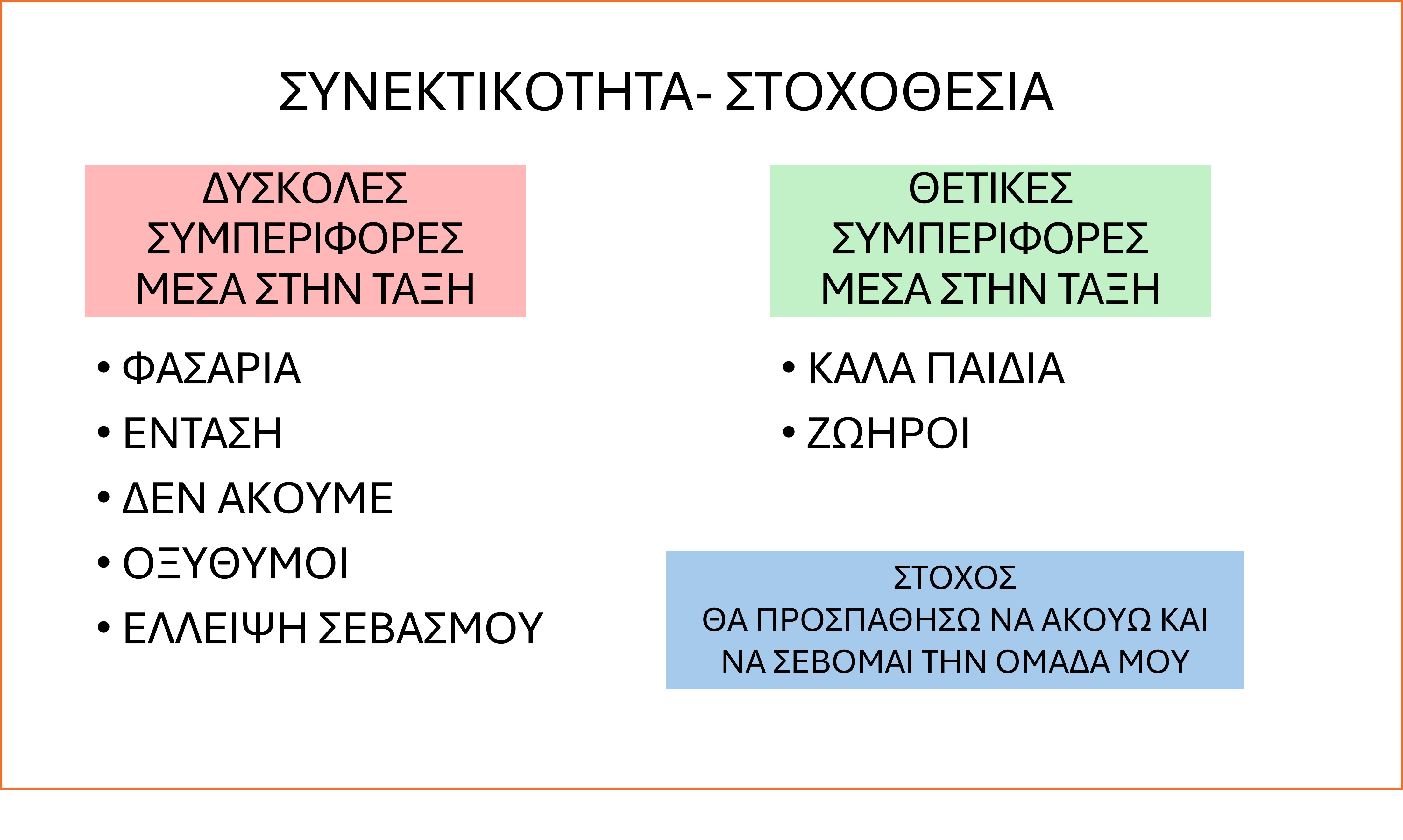 Οι μαθητές σημειώνουν δύσκολες και θετικές συμπεριφορές. Τις καταγράφουν και στη συνέχεια γίνεται συζήτηση στην τάξη με στόχο τη σύνδεση και την κατανόηση του πως οι επιμέρους συμπεριφορές επηρεάζουν την ομάδα. Τέλος, καταγράφονται οι στόχοι.